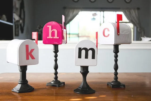 Find an old candlestick holder or any other stand you like (spray paint if needed). Find your small mailbox in the Dollar section at Target. Get some scrapbooking letters, or paint them on. Hot glue the stand to the mailbox and voila. Place happy mail in them anytime you want!